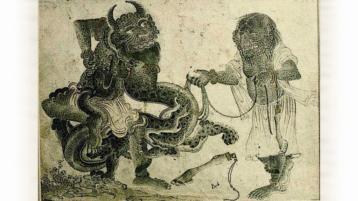 ‘The third man told the demon a story that was even stranger and more amazing than the first two. The demon was very much amazed and swaying with delight, said “I grant you one-third of my claim on him [the trader] for his crime.” Then the demon released the merchant and departed.’